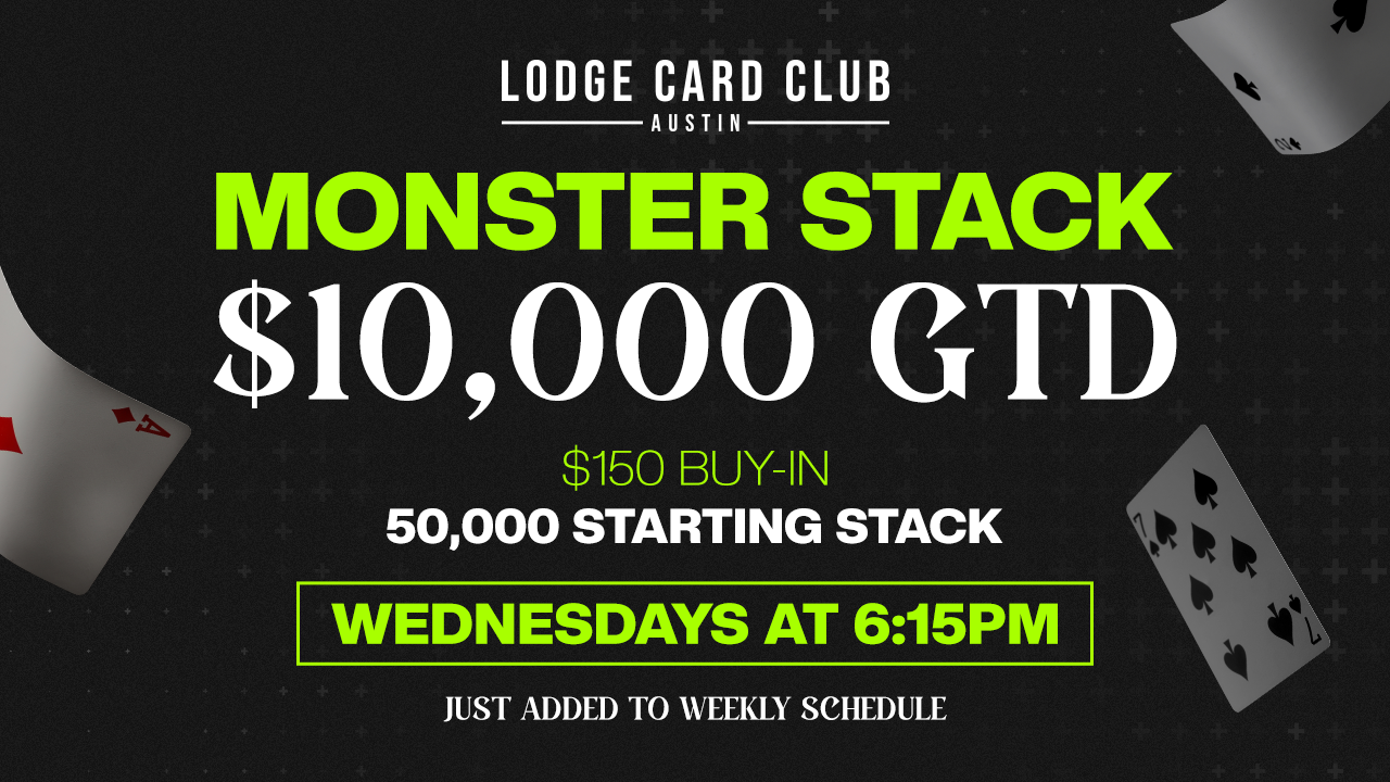Now serving Austin and San Antonio, Lodge Card Club is Texas’s leader in daily cash and tournament poker. Offering Texas Hold’em, Pot Limit Omaha, and more, Lodge Card Club is a members-only social club serving central Texas.