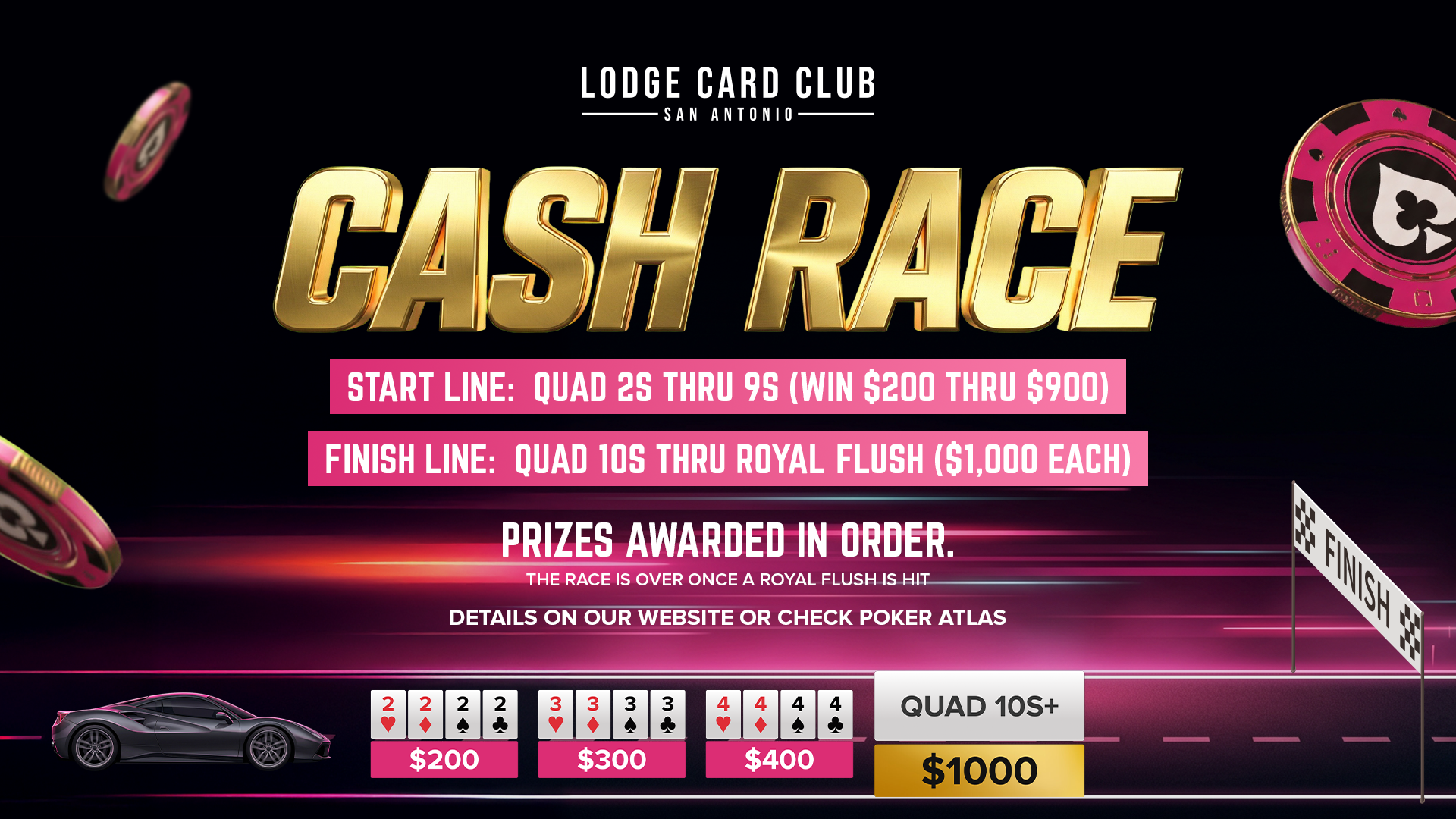 Quads: 2s = $200, 3s = $300, 4s = $400, 5s = $500, 6s = $600, 7s = $700, 8s = $800, 9s = $900Quad 10s thru Royal Flush = $1,000The race starts at quad 2s and progresses towards Royal Flush.Once a royal flush is hit, promo is over.